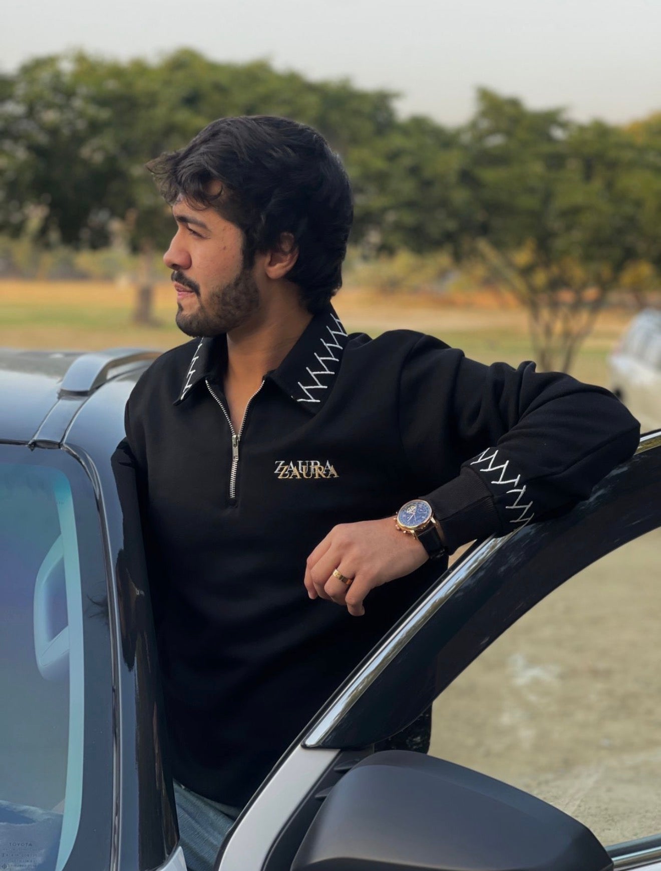 This stylish ZAURA half-zip sweatshirt blends modern streetwear aesthetics with premium comfort. Crafted from a soft, breathable fabric, it features a classic black base enhanced with beige embroidery on the chest logo, adding a refined touch of contrast. The zigzag stitch detailing on the collar and cuffs gives it a unique, fashion-forward edge.